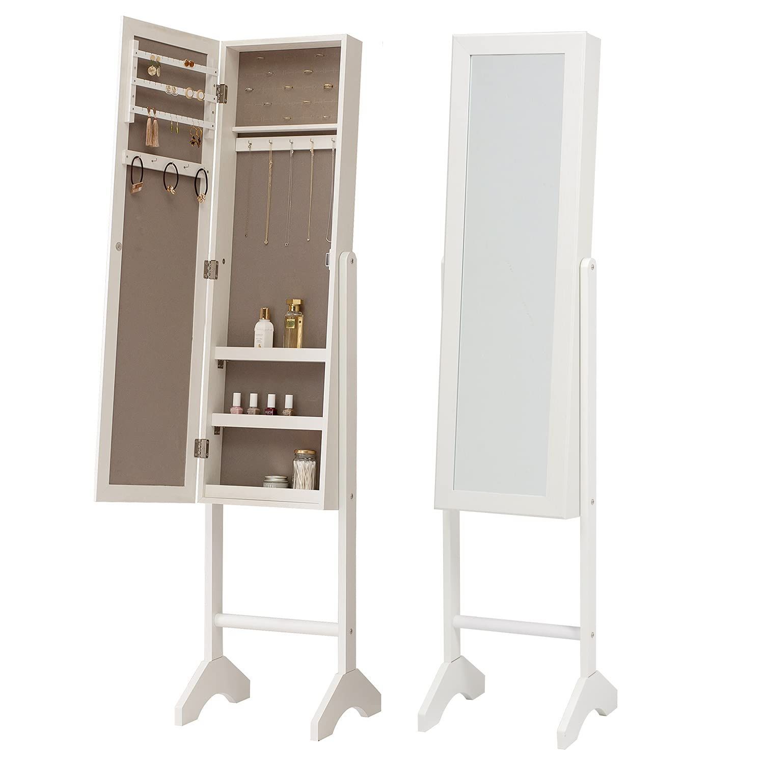 【ミラーの裏に隠して収納】 リングやピアス、ネックレスなどのアクセサリーが収納できるドレッサーの役割と、全身を映し身嗜みを整えるためのスタンドミラーとしての役割をどちらもこなします。