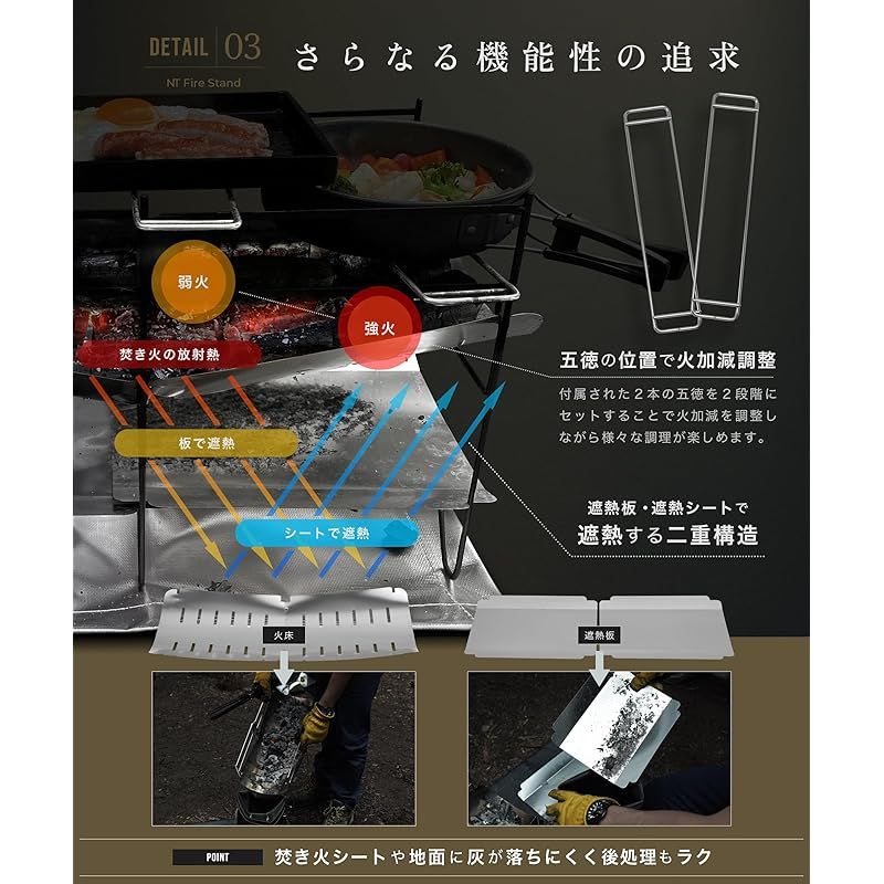 【お読みください】遮熱シートは放射熱をカットするシートであり、飛び火から地面を保護する焚き火シートではないため、別途焚き火シートをご用意して焚き火をお楽しみください。【自然を傷付けない事を一番に考えた設計】ZEN Campsが開発に一年以上かけて誕生した地面への遮熱を考えた自然を傷つけない焚き火台「NT Fire Stand」です。焚き火をするための火床に加え、焚き火からの放射熱をカットする「遮熱板 兼 灰受け」を装着する設計となっています。