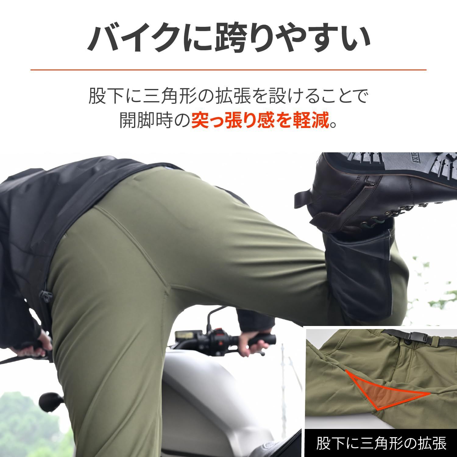 股下に三角形の拡張を設けることで、開脚時の突っ張りを軽減。バイクに跨りやすい設計になっています。