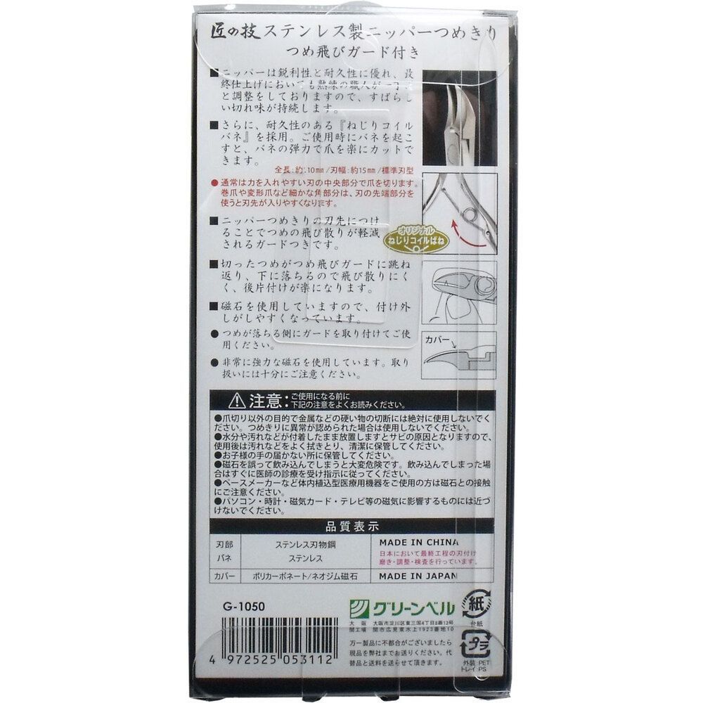 匠の技 ステンレス製 ニッパーつめきり つめ飛びガード付き G-1050