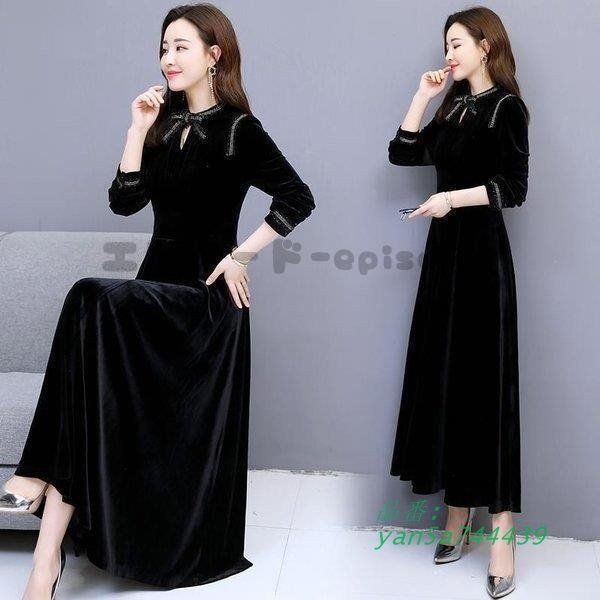 ワンピースレディース40代ロング丈長袖AラインVネックベロアリボン付き 結婚式ドレス二次会パーティドレス通勤お yan 5 a 744439