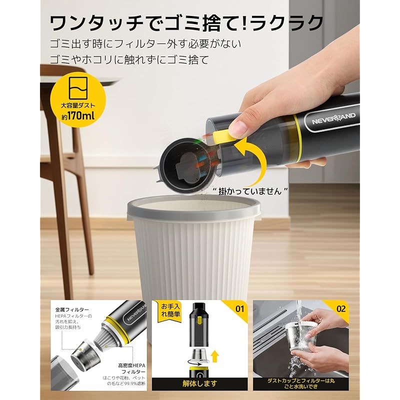 【ワンタッチでゴミ捨て&お手入れ簡単???】車用掃除機はワンタッチでダストカップを簡単に開けられ、手を汚さずにゴミをサッと捨てられます。集塵容積は 170mlと大容量で、頻繁にゴミを捨てる手間を省けます。独自のダブルフィルター(金属フィルター+HEPA フィルター)を搭載。金属フィルターが前段で大きなゴミを除去するため、HEPA フィルターの汚れを大幅に抑し、長期間高いフィルター性能を維持できるように設計されています。洗浄可能なHEPA フィルターは、0.3 ミクロン以下の微細塵埃(ダニのフン、花粉、PM2.5 など)に対し、99.97% 以上の高い捕捉能力を発揮。付属品として交換用 HEPA フィルターX 1 個を同梱しており、後からのメンテナンスも簡単に行えます。ダストカップとフィルターは水で丸洗いが可能なので、いつも清潔に保てます