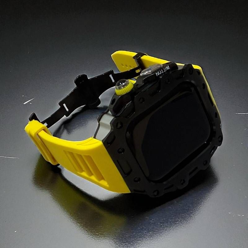 アップルウォッチケース フォージドステンレス ラバー 互換性対応 カスタム カバー 保護 ギフト 46mm ベルト バンド セット series 10 11 メンズ レディース 贈り物 イエローブラック