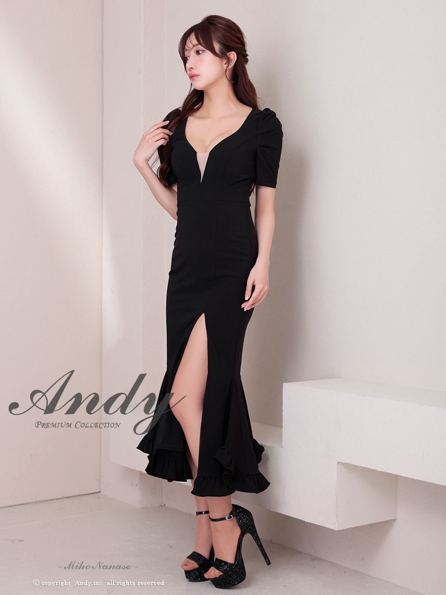 ブラックM OF 05 ON 2918-W-2503 ANDY アンディ パフスリーブ 袖あり バストシアー 裾フリル スリット マーメイド ミディアムドレス キャバドレス