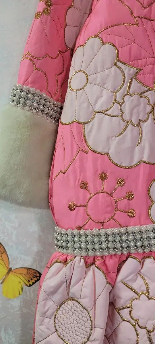 ピンク色のバターンに花柄 刺繍が施されたかわいいデザインです。ファー袖部分にキュービックとパール 装飾がPOINT ポイントで付いています。