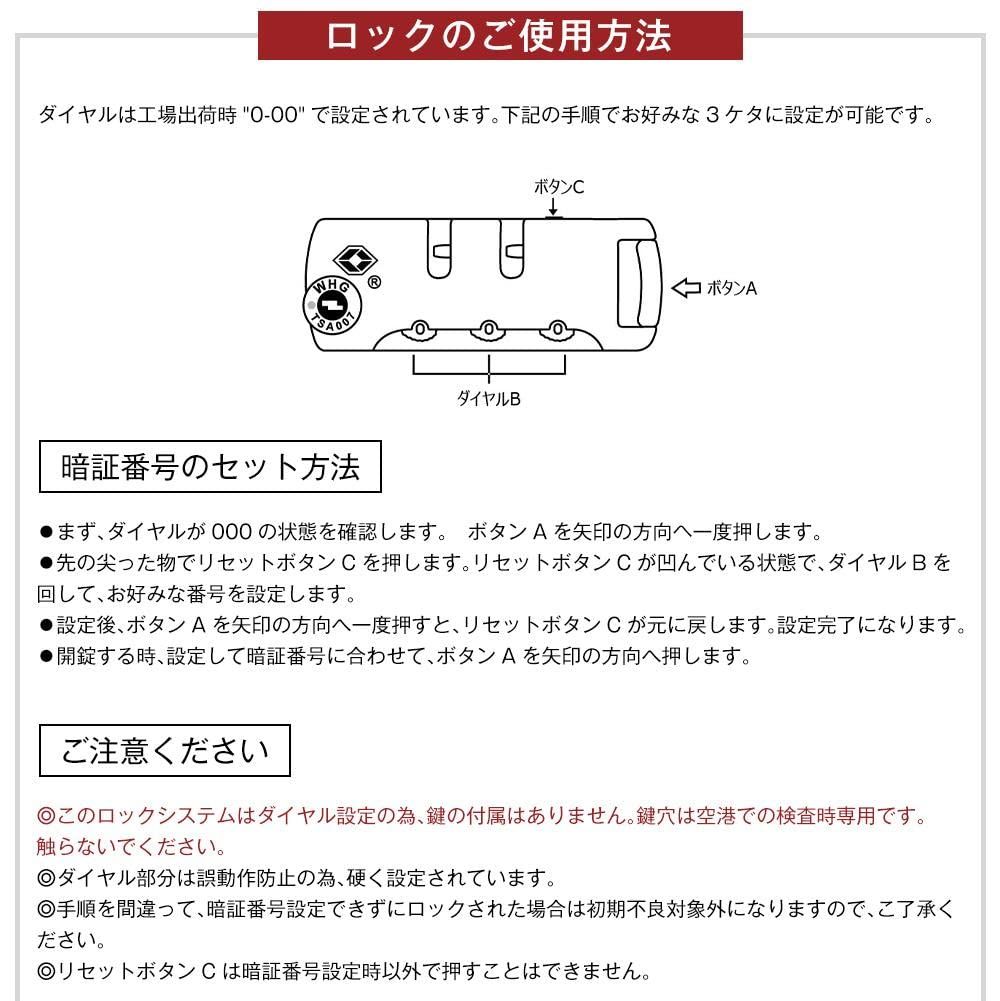 POINT 1 超軽量 女性でも軽々と持ち上げることができる驚きの軽さ。 軽量だから階段もラクラク。 女性の方でもらくらく。旅先で重い荷物を持っての移動や、階段の上り下りはシア宮内ですよね。 そこで一般的な同サイズの中でも、重量の軽いスーツケースを作りました。 軽量スーツケースは海外旅行の、重さ制限にも有利。 POINT 2 傷・汚れに強いエンボス加工 旅先で、ホテルまでの移動や段差など、荷物を入れるのなら、できるだけ軽く、強い素材いい。 そんな経験から、エンボス加工を施したABS+PC混合樹脂を採用しました。 衝撃にも強く、無数に細かい凸凹が傷をつきにくくしてくれます。 しかも1ランク上の高級感を実現。 スーツケースに求められるのは強度です。ABS樹脂は野外で使われ強度が必要とされるヘルメットなどにも使われています。PC樹脂は光沢が美しい特性を持っています。スーツケースの表面はつるつるの上にピカピカ見られます。 POINT 3 旅を彩るデザイン 鮮やかで美しい色をしたスーツケース。 色は、単なる色だけではありません。 あなたの個性を伝えるコントラストカラーデザインを作りました。 POINT 4 海外旅行の必要「TSAロック」 TSAロックはアメリカ運輸保安局によって認可されたカギで、セキュリティチェックのため施錠が禁止されているアメリカでも、施錠したまま航空会社に預けることができます。アメリカ旅行をする方はもちろん、乗り続ぎでアメリカの空港を利用する場合にも便利です。 POINT 5 三段階調整可能ハンドル キャリーバー耐久性抜群 男性でも女性でも使いやすい、調整ハンドルを採用。 またハンドル自体の高さも、最高で地上から100cmのところまで伸ばすことができます。 小型のスーツケースの中には、ハンドルの高さの低いものもありますが、こちらのスーツケースは、背の高い方にもオススメです。 POINT 6 360度全方向消音キャスター 4輪に、ノングリース360度全方向回転キャスター搭載。 消音設計と耐久性抜群のキャスターで凸凹な路面でも移動もスムーズ。 POINT 7 角を保護するコーナープロテクター 空港で預けた荷物は、他の荷物とぶつかったりして、どうしてもコーナー部分に衝撃が加わります。そんなことがないように、コーナー部分を擦れや衝撃に強い素材で作ったパットでガードしました。また、コーナープロテクターはボディとフットしていなければ、正しく性能が発揮されません。それを設計段階から緻密に計算し、デザイン性と実用性を兼ね備えた美しく強いボディとなっています。 POINT 7 長時間持ち可能の取っ手 製品の使用上、取っ手を掴んで本体を持ち上げると取っ手の横に隙間ができます。本体を降ろすと元に戻りますが、その際に誤って指や衣類などを挟まれますケガをされる恐れがございますので充分ご注意頂きますようお願いいたします。 POINT 8 たっぷり入る使いやすい内装 中には凸凹がありますが、容量を重視している人はケースサイズいっぱいまで荷物を詰め込むことが可能です。また仕切りには小物の収納に便利なメッシュポケット付きで細かく仕分けることができます。ビジネスで利用する人にとっては、これは結構便利です。 ※内部ファスナーについて: ケース内部にあるファスナーはメンテナンス専用ファスナーとなります。修理が必要になった場合にのみ使用するファスナーのため、あえてファスナーのつまみが付いていません。お荷物を入れるものではありませんので、ご注意ください。