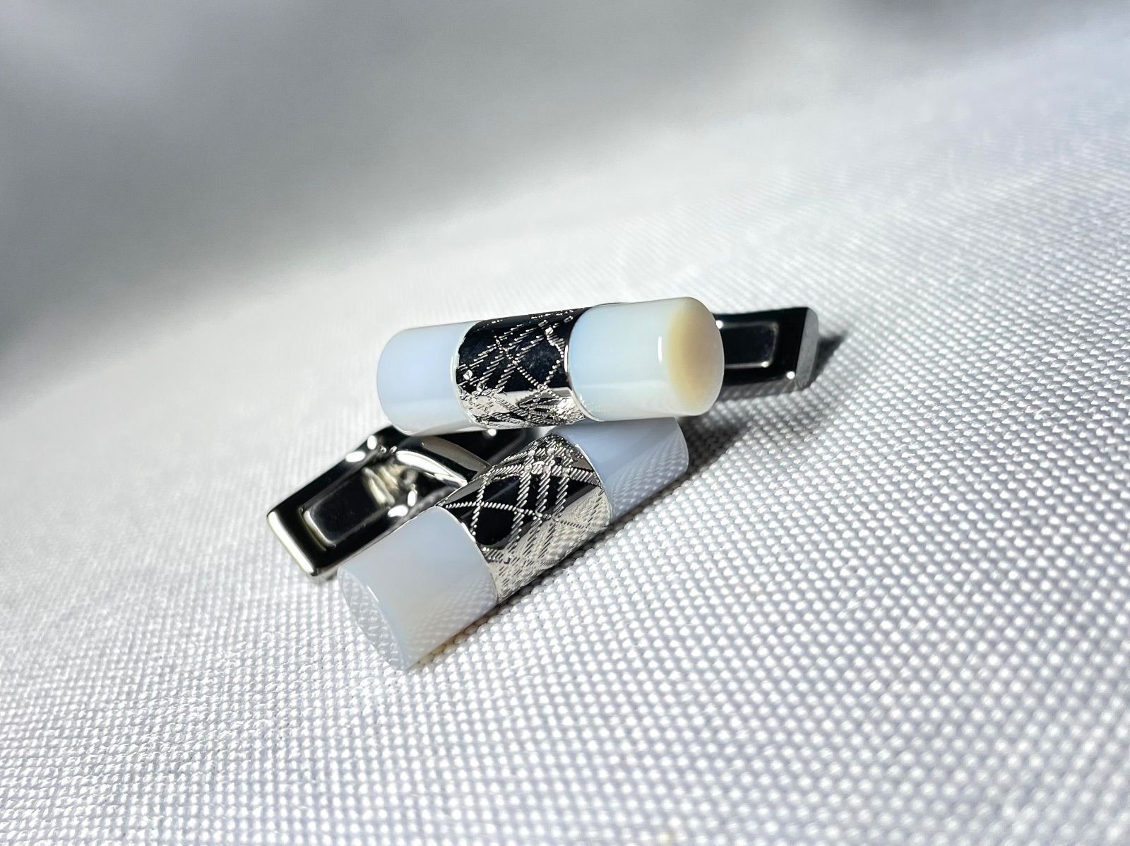 Burberry バーバリー チェックライン&グレーストーン装飾 バー型カフス カフリンクス ボタン クロームシルバーメタリック メンズ