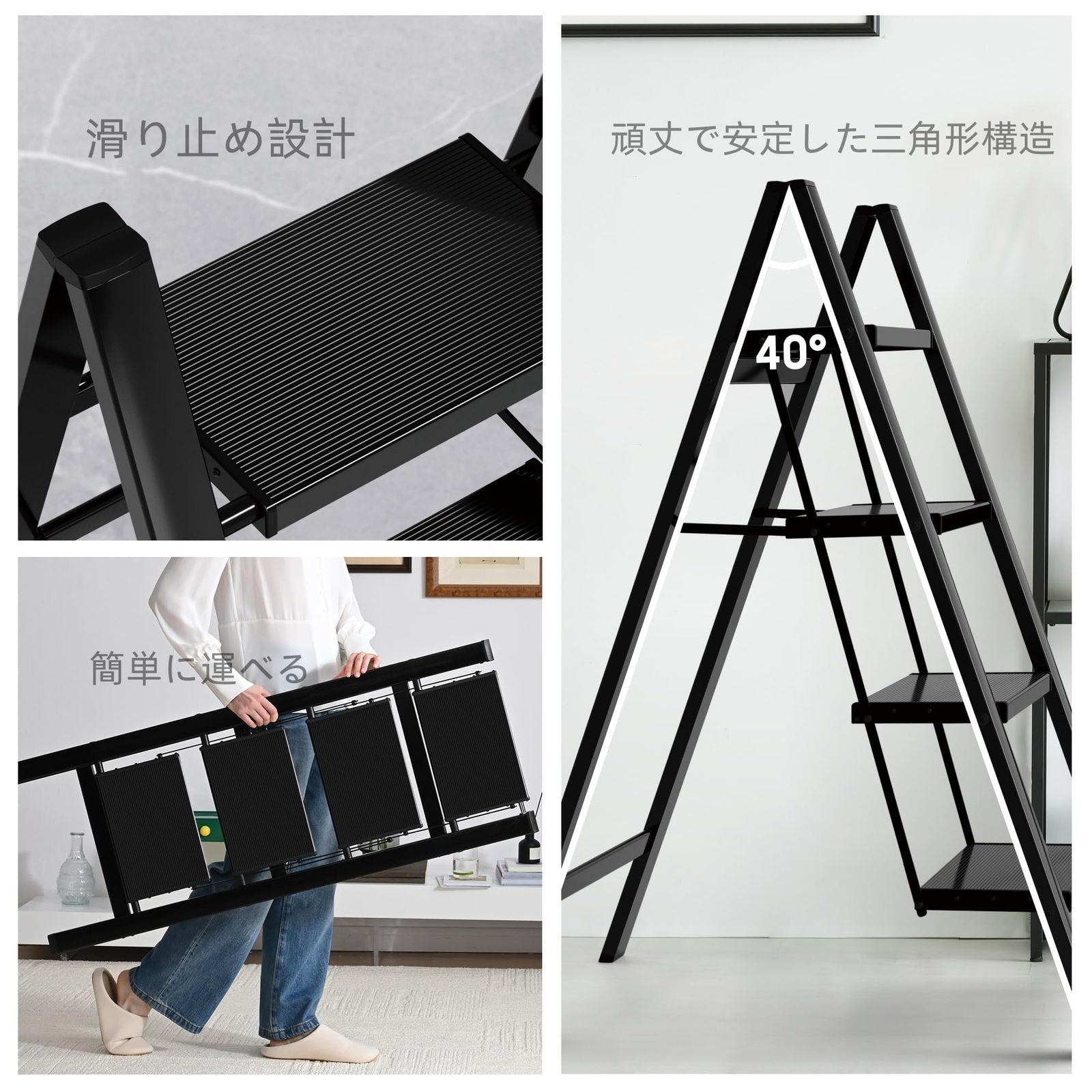 四段 黑 脚立 折りたたみはしご アルミ製広い滑り止め付きステップと便利なハンドグリップ 軽量 折りたたみ ステップは耐荷重150 kg 家庭やオフィスに最適