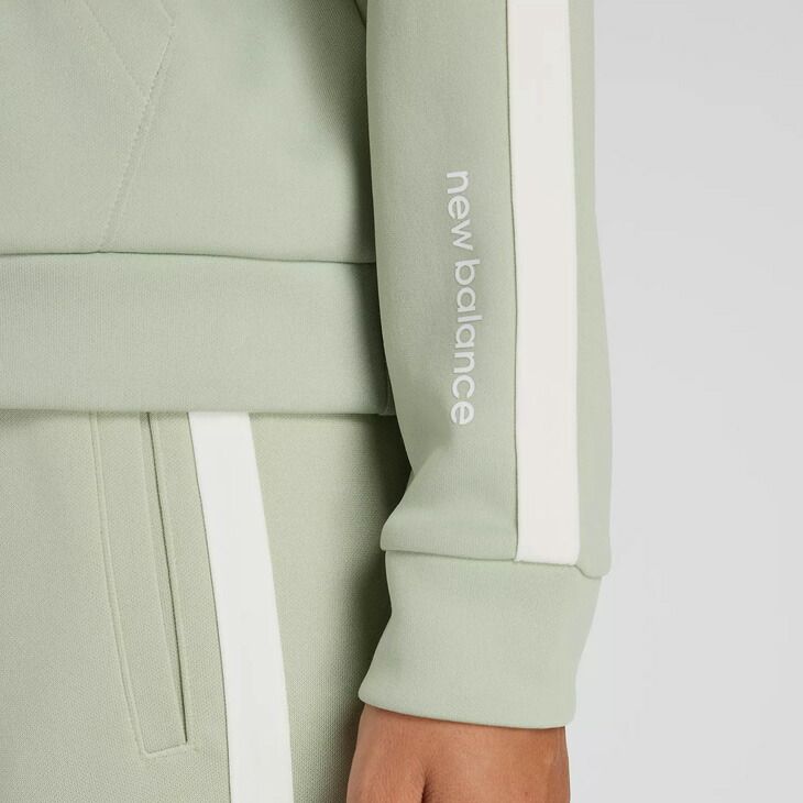 左胸のNBロゴ刺繍と左袖のNBリニアロゴ、サイドラインテープがデザインポイントです。