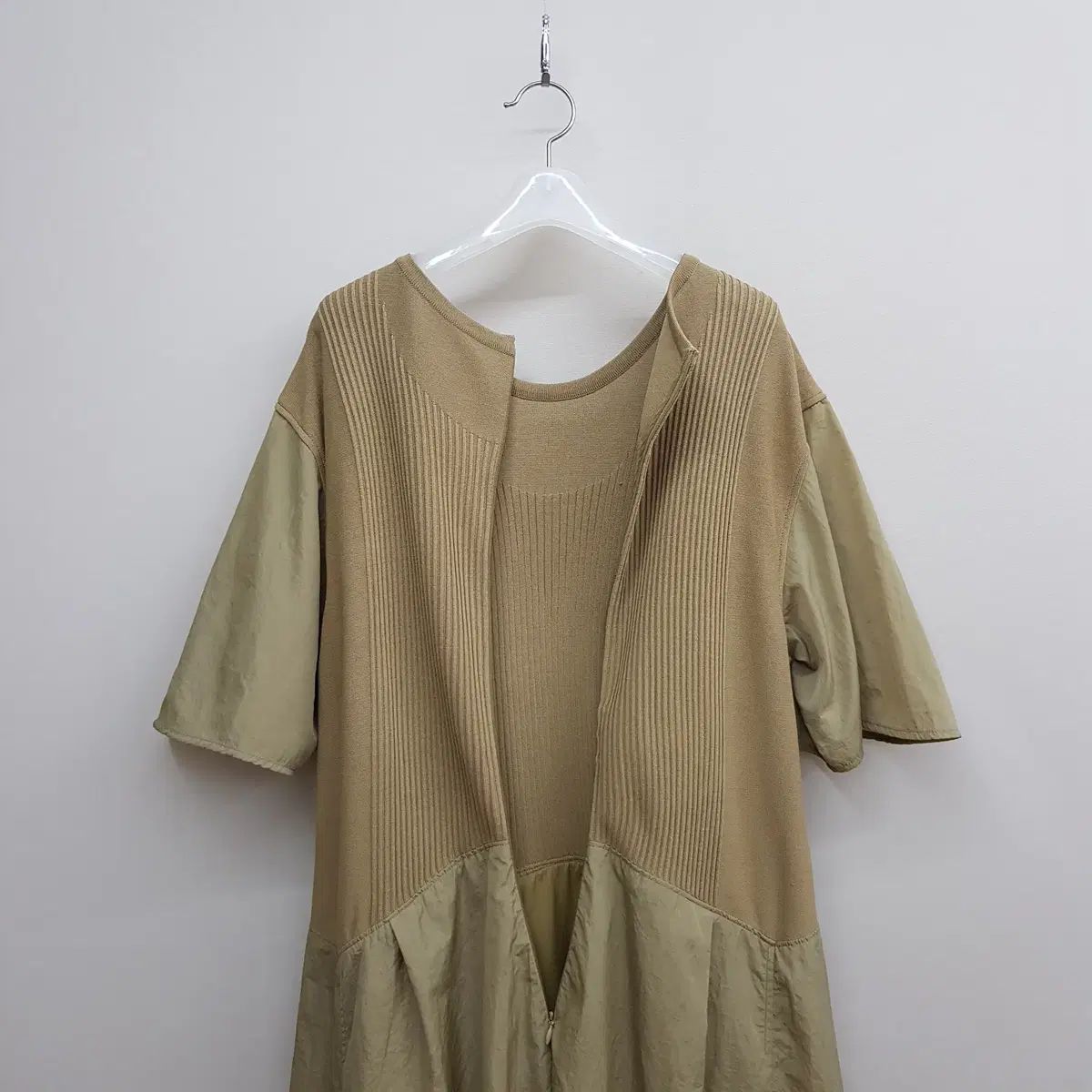 > 特徴: ニットとナイロン素材がミックスされたユニークなデザインのロング ONE PIECE です。上部は緻密なリブニット編みで安定感のあるシルエットを演出し、下部は軽くてほのかな光沢感のあるナイロン素材で自然に流れるフィット感を演出します。ウエストラインが強調されるスリット ディテールでスリムに見える効果を与え、腕部分もバイカラー 生地で構成されエレガントな雰囲気を完成しました。単独ではもちろん、様々なアウターとレイヤードしてシーズンレスに活用できるアイテムです。