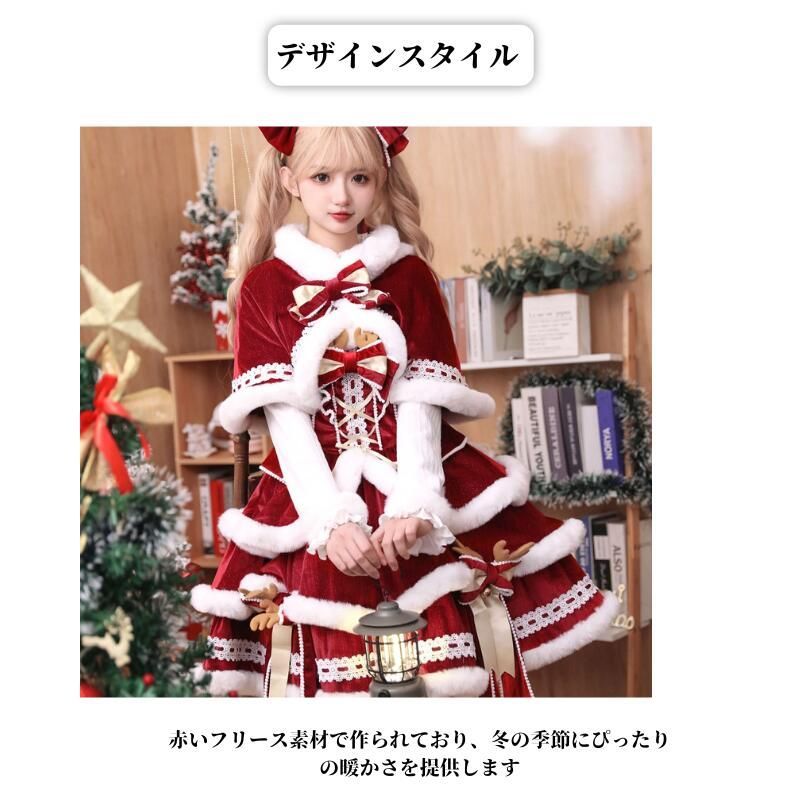 このサンタ風コスチュームは、赤いフリース素材で作られており、冬の季節にぴったりの暖かさを提供します。フリルとレースの装飾が施されており、可愛らしさを引き立てます。