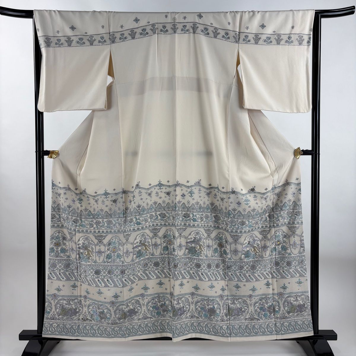 訪問着 身丈160 cm 裄丈65 M 袷 花食い鳥 草花 刺繍 金糸 クリーム 正絹 一つ紋