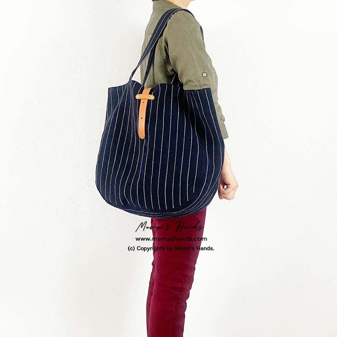 ⭐️厚めのリネン生地を使用。2枚仕立ての軽い大きめバックです。革とギボシが付いているので、バックに入れる物の大きさによって、3段階で留められます。