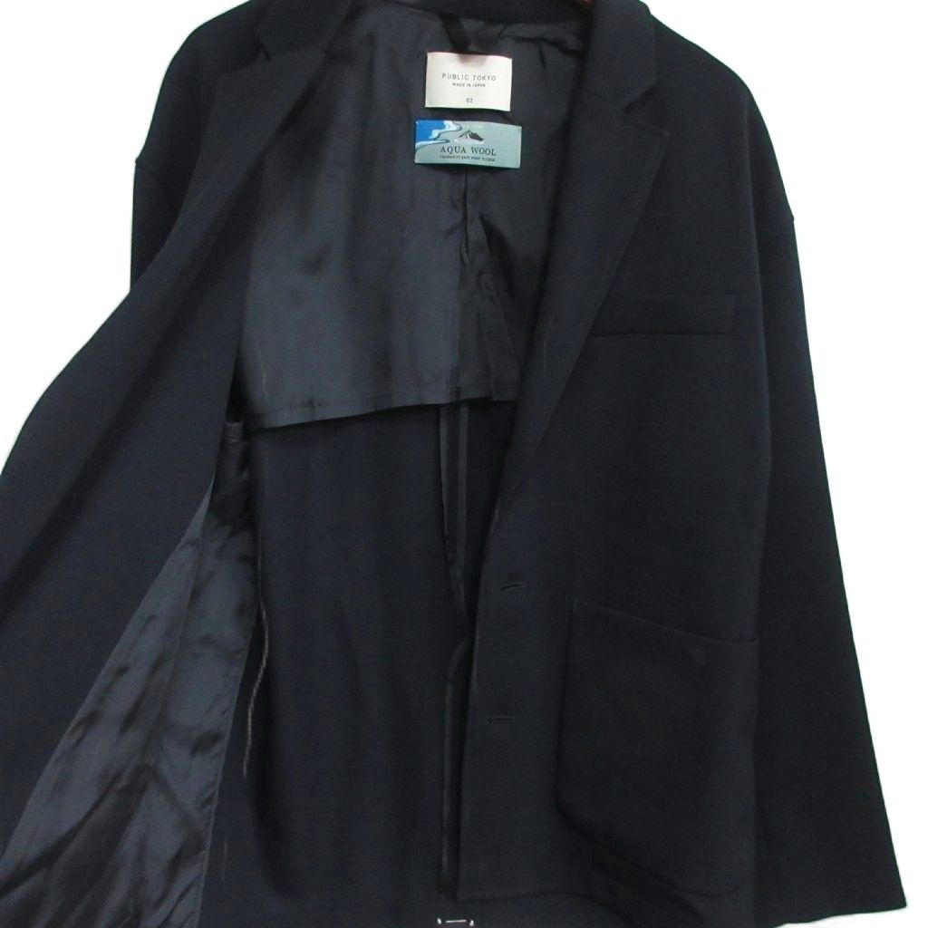 パブリックトウキョウ PUBLIC TOKYO 21年 AQUA WOOL アクアウール カルゼ セットアップ ジャケット-パンツ シングル 3 B ゴムウエスト 背抜き 紺 ネイビー サイズ2