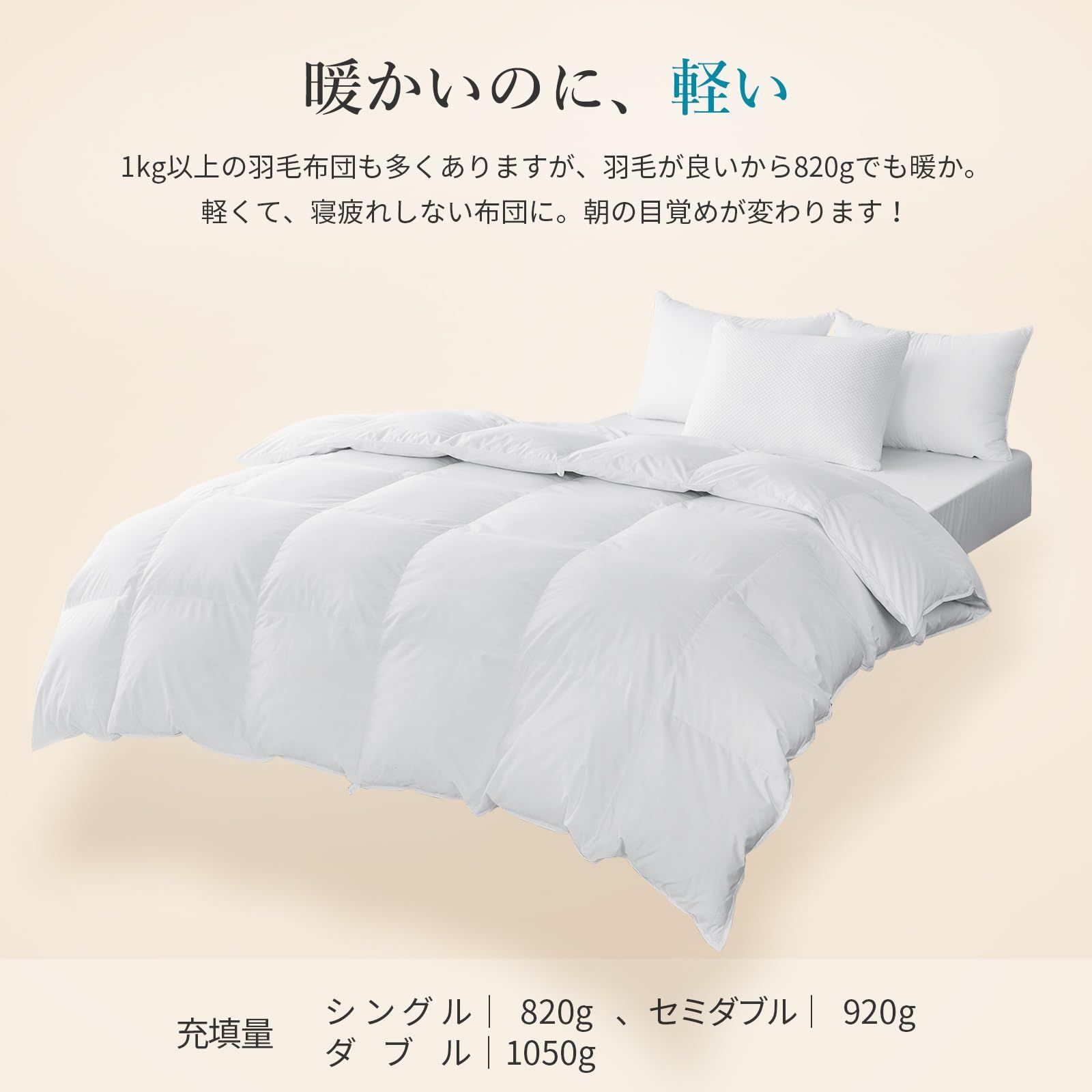 【布団仕様】側地:綿15%、ポリエステル85% / 詰め物:ホワイトダックダウン(ダウン85%、フェザー15%) 【重量】:150x210cm 約1.63kg (充填量0.82kg)