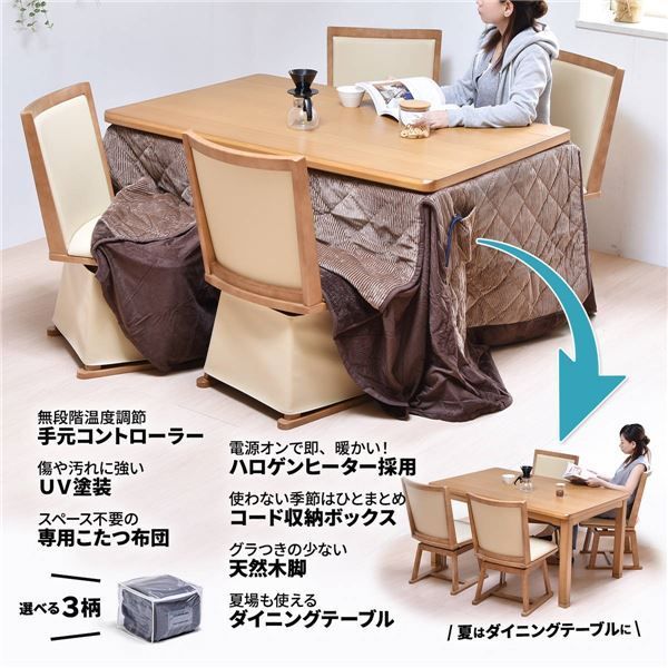 タモの突板をふんだんに使用し、落ち着いた見た目のハイコタツ兼ダイニングテーブルと、回転式チェアーが4脚と、掛布団の合計【6点セット】です。天板の端を少しアールをつけた加工を施す事で少し丸みのあるデザインなので、直線的な工業品とは一線画した自然な風合いがあります。コタツは高さ65cmと68cmの2段階調整ができ、お好みの高さでご使用いただけます。ヒーター部分は安心な日本メーカーのメトロ電気工業の製品が使用されており、手元で温度調節ができるコントローラー付いていて便利です。チェアーは立ったり座ったりするのに便利な回転式です。コタツとチェアーは「ブラウン」と「ナチュラル」の2色展開で、両方ともシンプルで落ち着いた色なので、お部屋にマッチしやすいです。掛布団は3種類の中か選べて選択肢もたくさんあるので、お好みの組み合わせが見つかります。