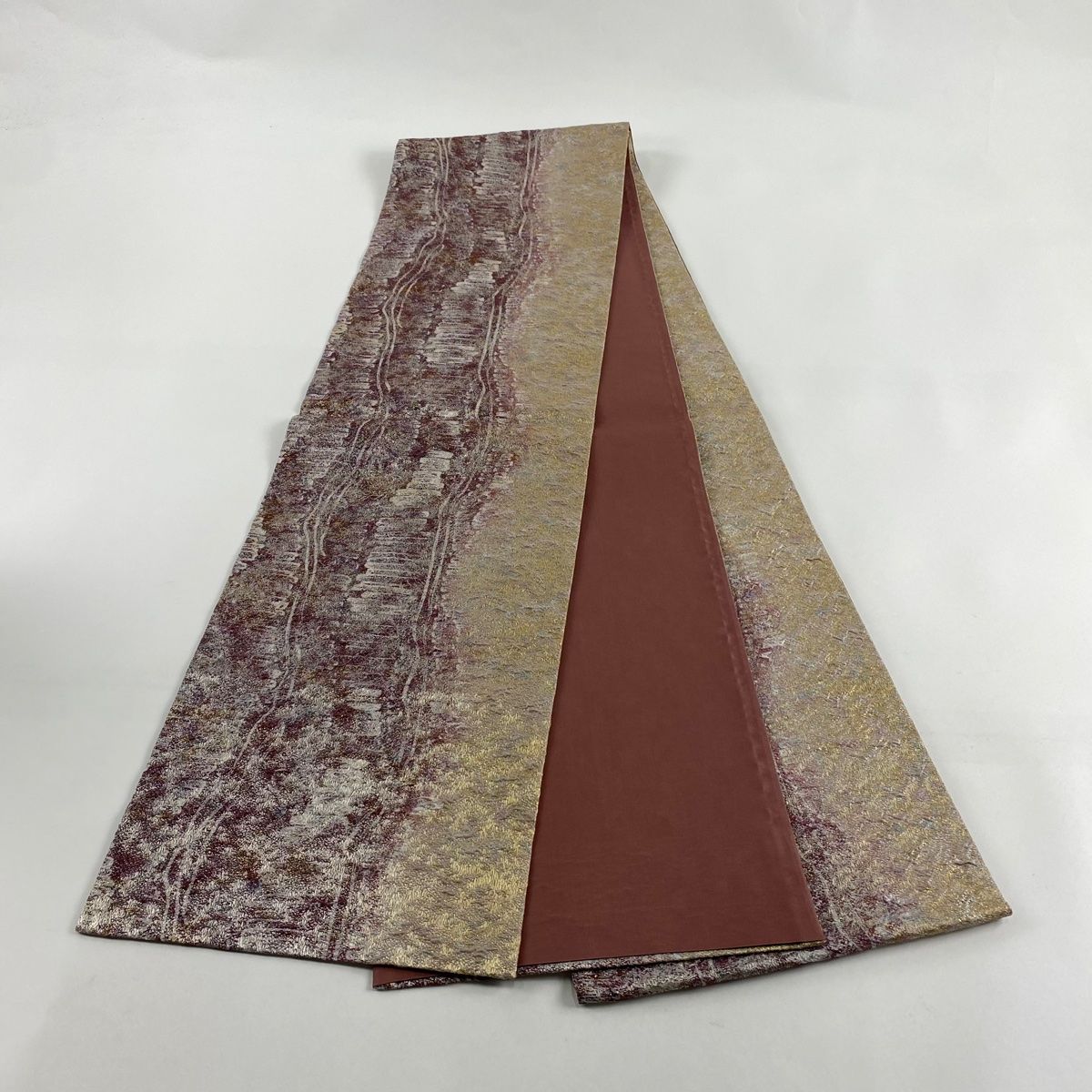 袋帯 秀品 幾何学模様 金銀糸 箔 小豆色 全通 正絹