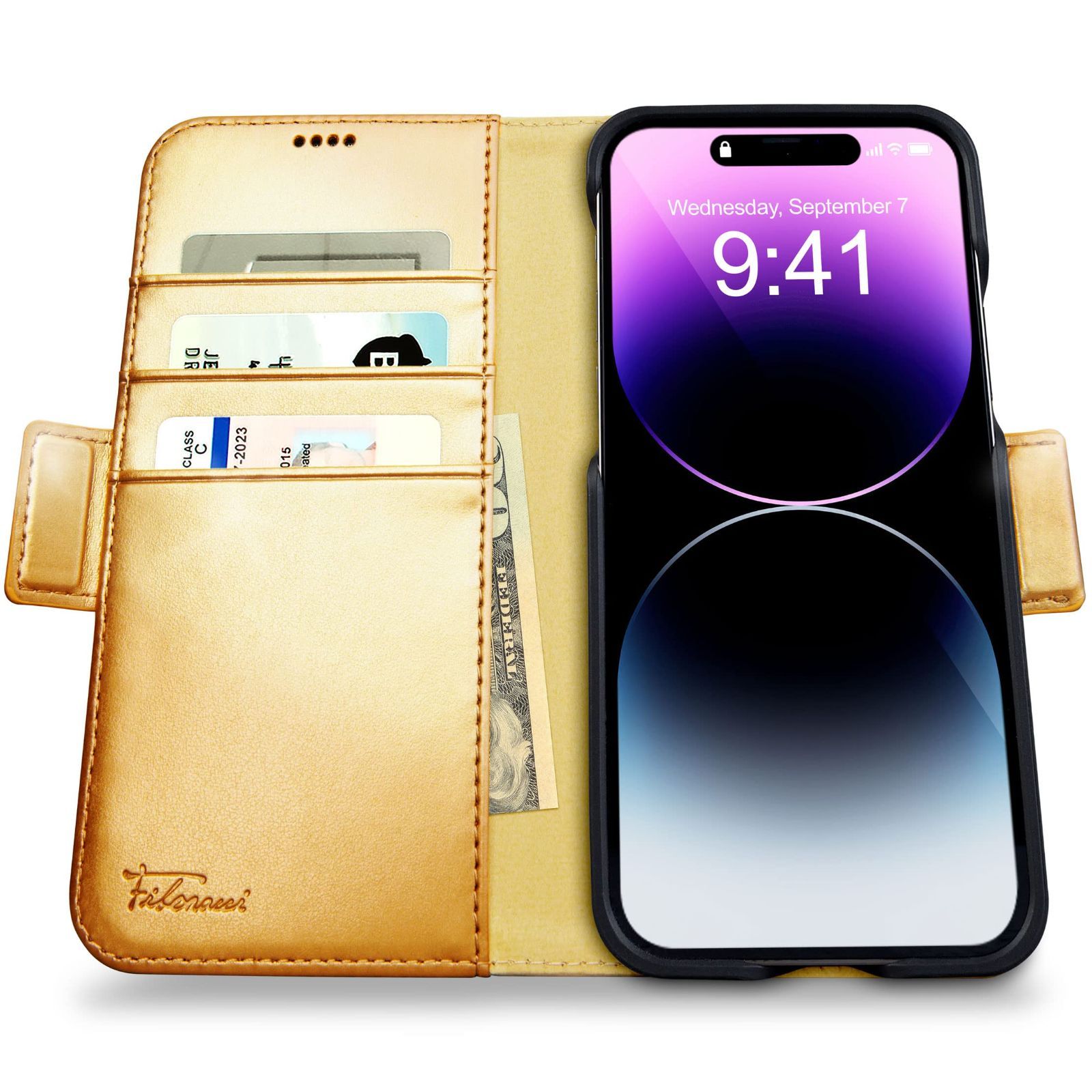 Dreem フィボナッチ(Fibonacci)2イン1 財布型ケース Apple iPhone 14 Plus用 - 高級ヴィーガンレザー製 マグネット着脱式 耐衝撃 携帯電話ケース RFIDカード保護機能 2通りに使えるフリップスタンド付き - ゴールド