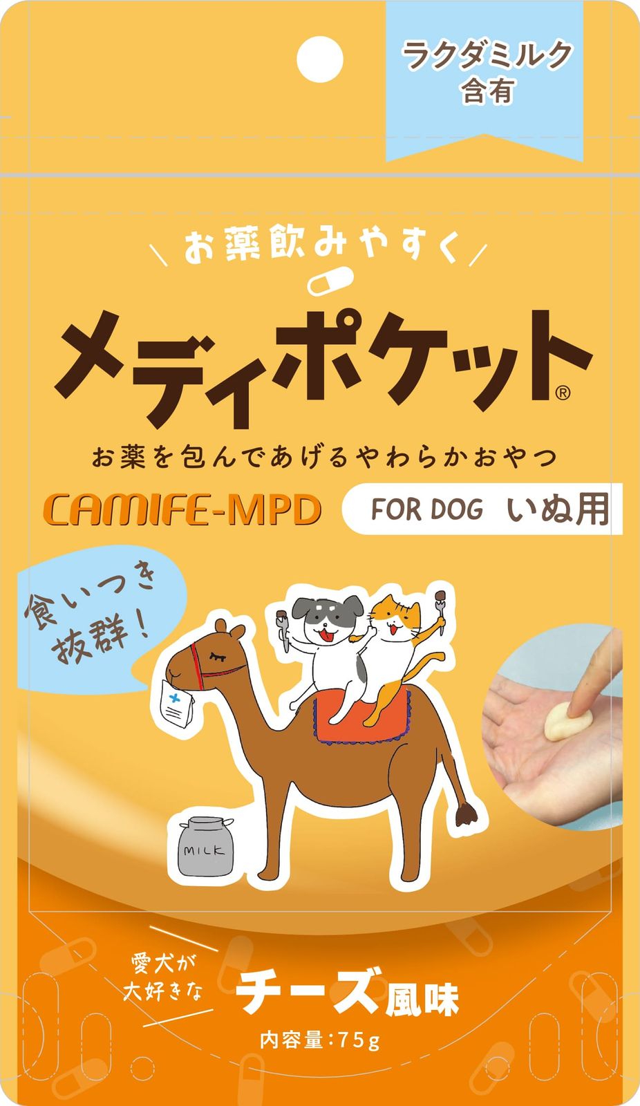 ラクダ乳含有の投薬サポートフードのワンちゃんが嫌がる薬など嗜好性の高いおやつに包んで与えスムーズに。