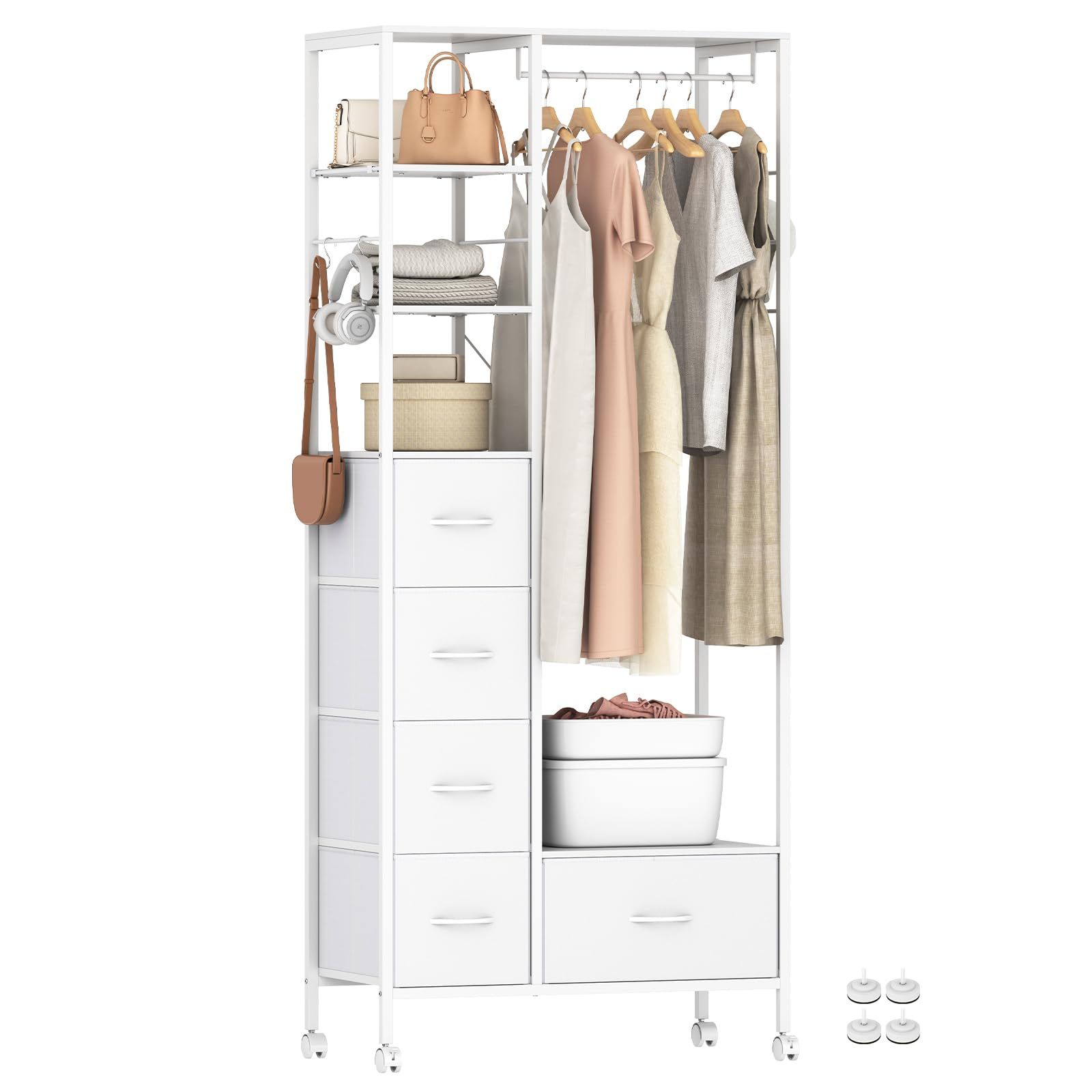 LunarLight ハンガーラック ワードローブ 引き出し付き 大容量 頑丈 全体耐荷重200kg キャスター付き 棚板可動式 収納付き 洋服収納 パイプハンガー 洋服掛け 衣類 衣装 クローゼット サイズ 幅80奥行40高さ188cm(真っ白)