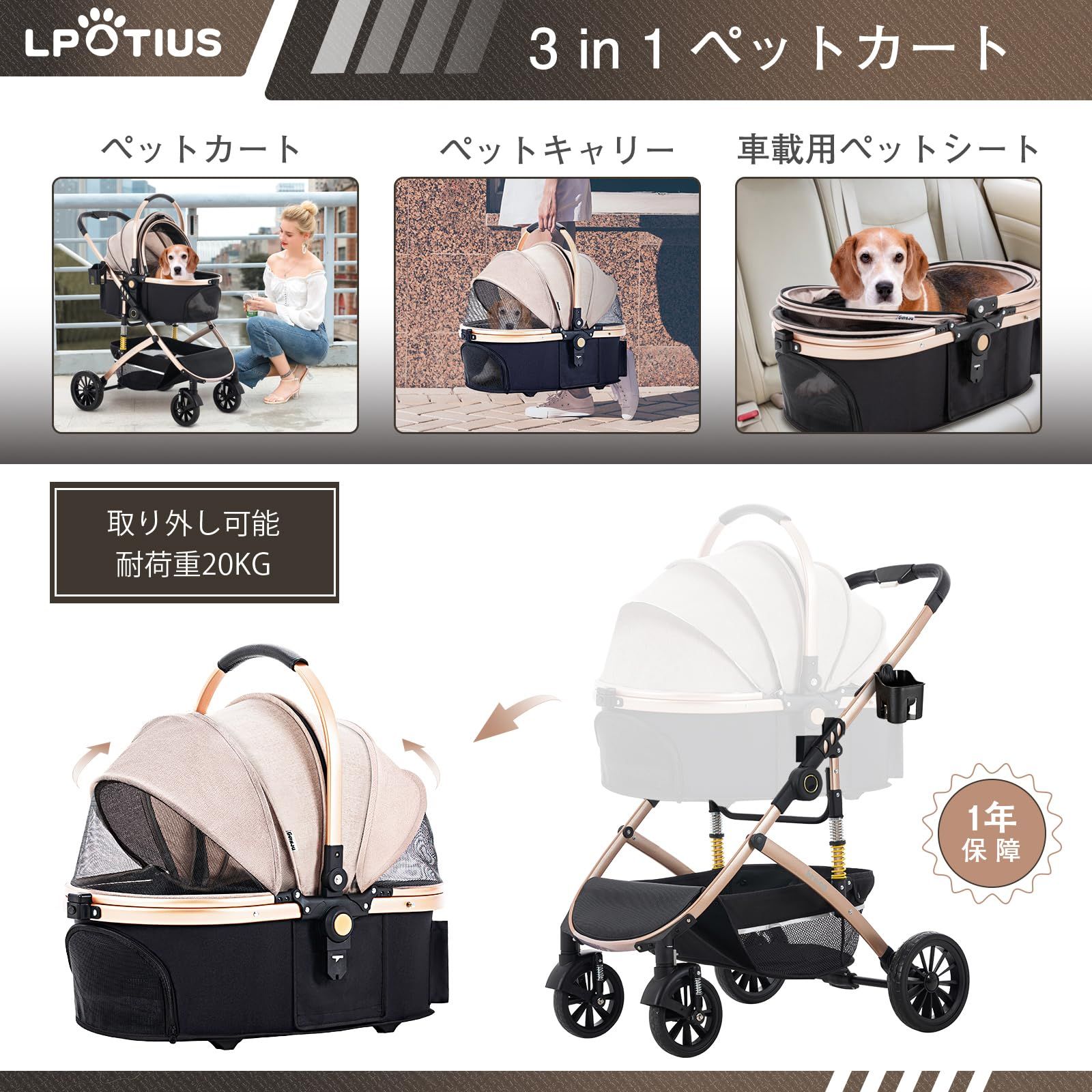 数量 犬バギー 猫カート 介護用 お出かけ 組み立て簡単 後輪ブレーキ付 前輪360°回転 耐荷重20 KG 4輪 ペットバギー 多頭飼い対応 猫犬兼用 中型犬 ペットキャリー レインカバー付き シャンペン 前後窓カバー付き 両対面式 犬用ベビーカー 3