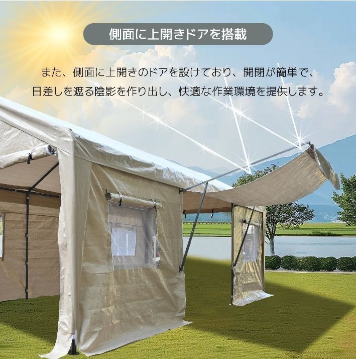 ◎03ファスナーで開閉可能 保護機能ファスナー部分もしっかりと閉められ、雨や風から中身をしっかり保護します。外的要因から大切な物を守るのに最適です。使い勝手が良い出し入れがしやすく、作業の効率をアップさせます。日常的な使用でも負担にならない設計です。側面に上開きドアを搭載また、側面に上開きのドアを設けており、開閉が簡単で、日差しを遮る陰影を作り出し、快適な作業環境を提供します。