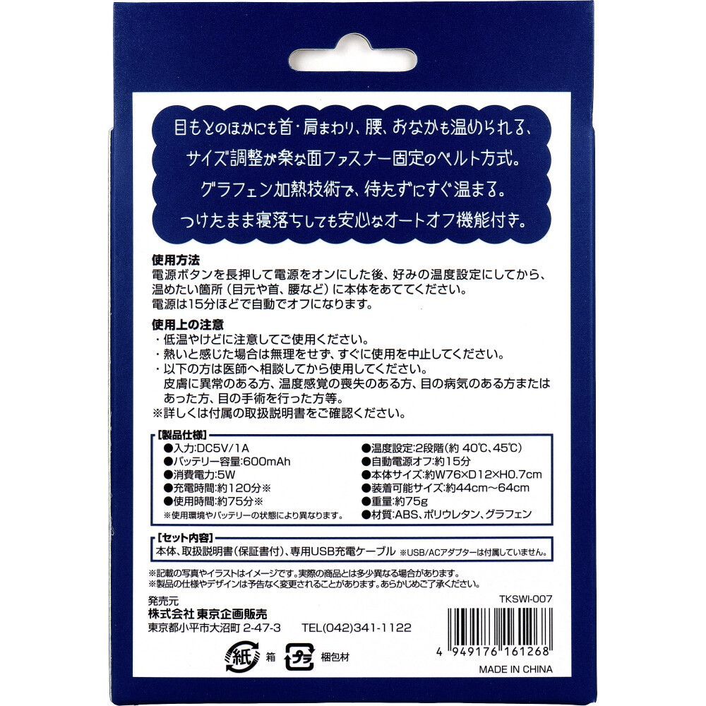入力:DC5V/1Aバッテリー容量:600mAh消費電力:5W充電時間:約120分(※)使用時間:約75分(※)温度設定:2段階(約40度、45度)自動電源オフ:約15分本体サイズ:約W76×D12×H0.7cm装着可能サイズ:約44cm~64cm重量:約75g材質:ABS、ポリウレタン、グラフェン※使用環境やバッテリーの状態により異なります。