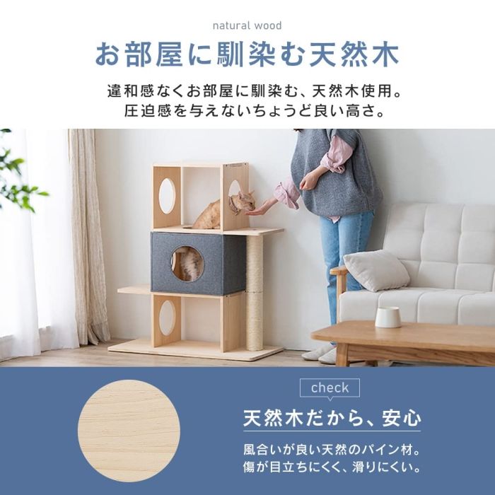 天然木を使用し、ナチュラルなインテリアにも馴染むシンプルなデザインの3段のキャットタワーです。ステップやネコが通れる穴付きで元気にお家で遊べます。隠れ家にもなる着脱可能なファブリックカバー付きです。ネコが立ってのびのびと爪とぎができる爪とぎポール付きです。お客様組み立てとなります。 耐荷重(約):棚板1枚あたり6kg