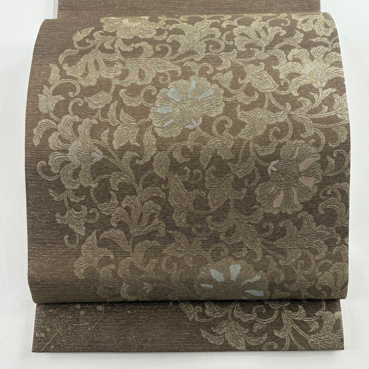 袋帯 となみ織物 落款 総紗縫 大華文 段縞 箔 灰茶 お太鼓柄 正絹