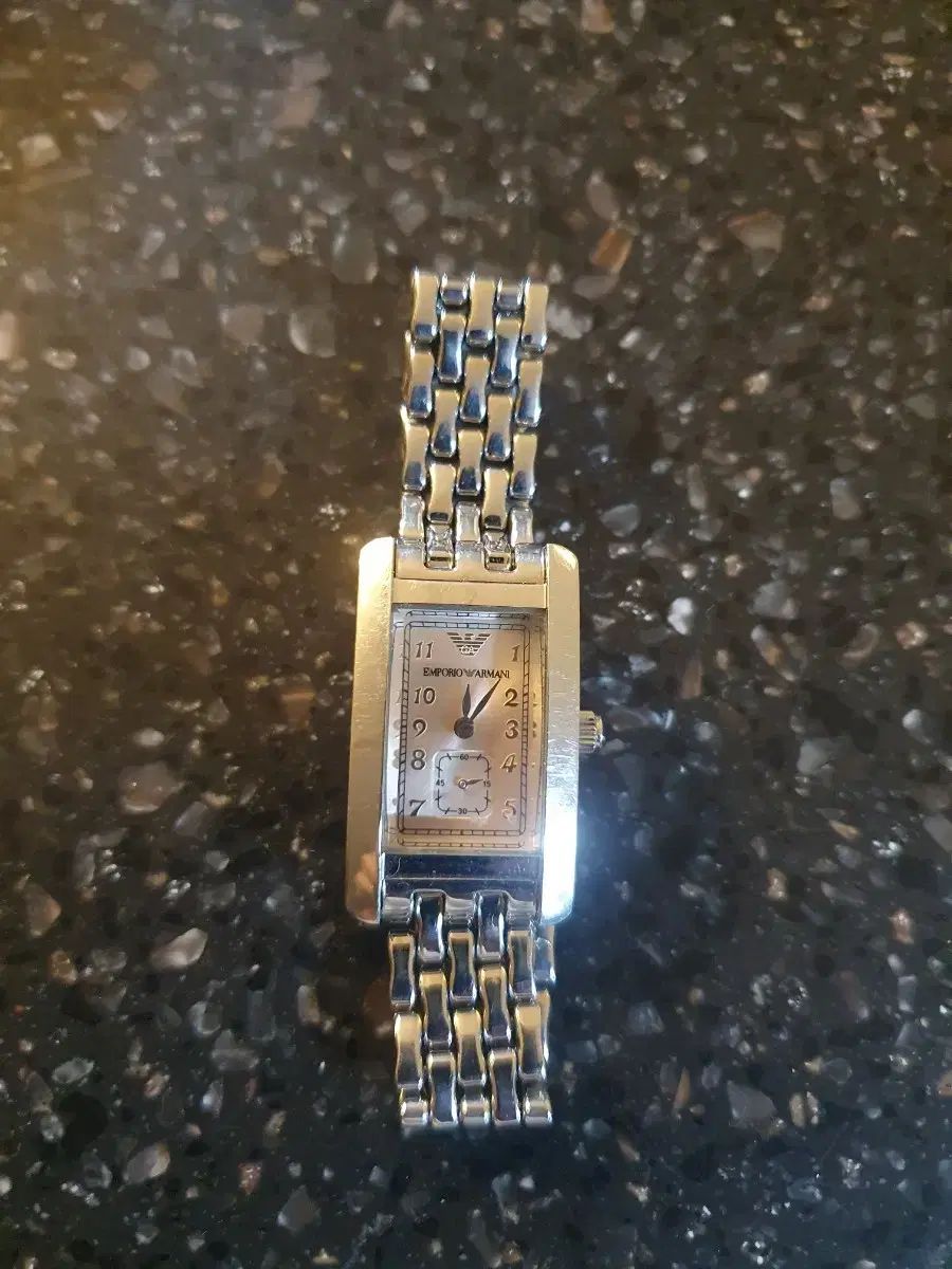 これはエンポリオアルマーニ正規品女性用時計です。この時計にはシルバーのメタルバンドと魅力的なライトピンクの四角いフレームが付いています。