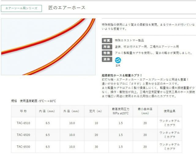 十川産業 超柔軟 エアーホース 6 5 mm 30 m TAC 6530 匠のエアホース カプラー付 ソフト 常圧 プロ用 柔らかい 大工用 エアーツール コンプレッサー