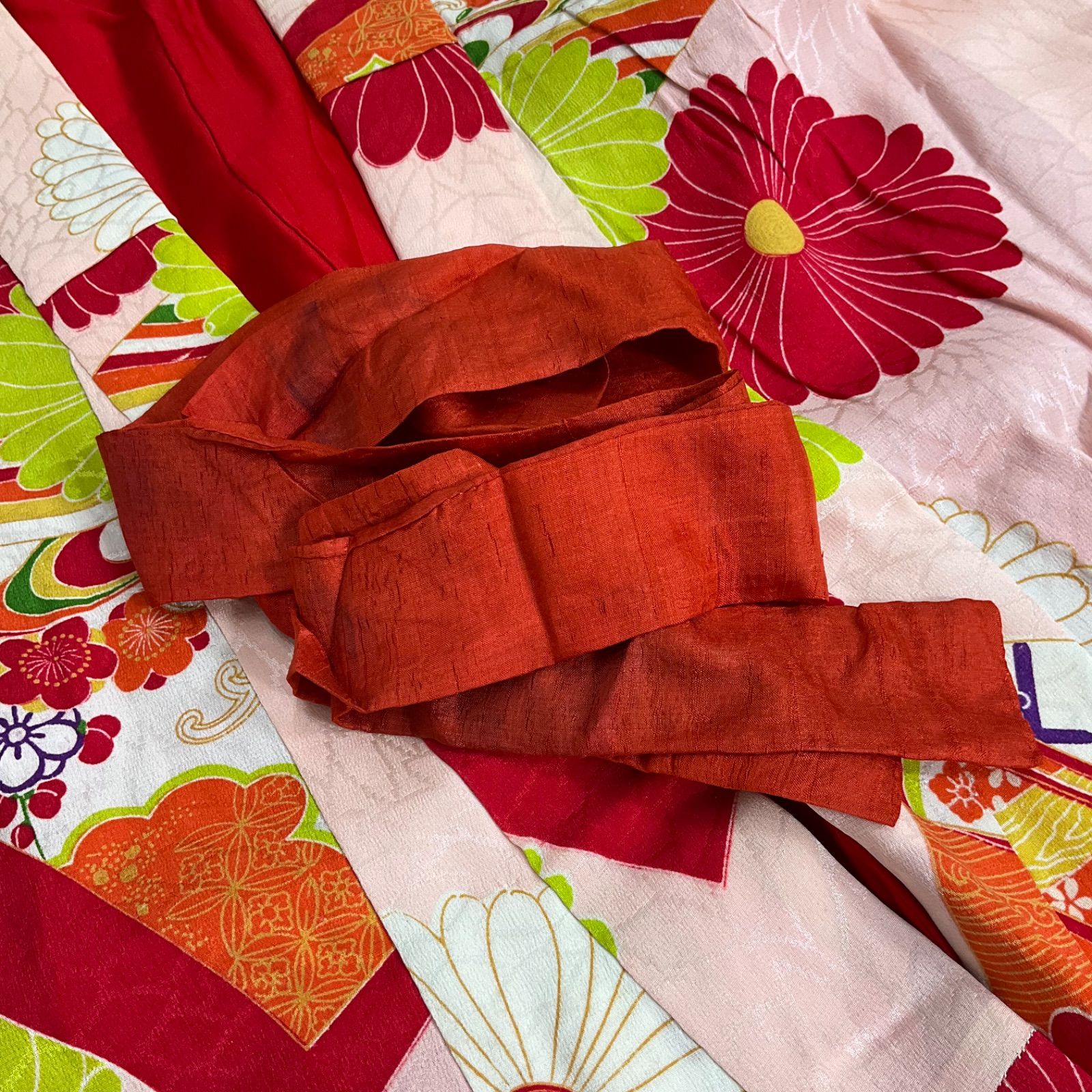 kimono one 7歳くらい用 アンティーク子供着物 綸子正絹 七五三 裄55 5肩丈144 七五三お詣り女の子着物こどものひお正月卒業式十三詣り G 312