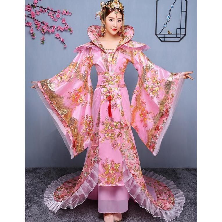 高品質 漢唐時代中国風ウエディングドレス 中国古代宮廷衣装 振袖プリーツ引き裾ロング唐装漢服 スパンコール刺繍 な古典舞台衣装