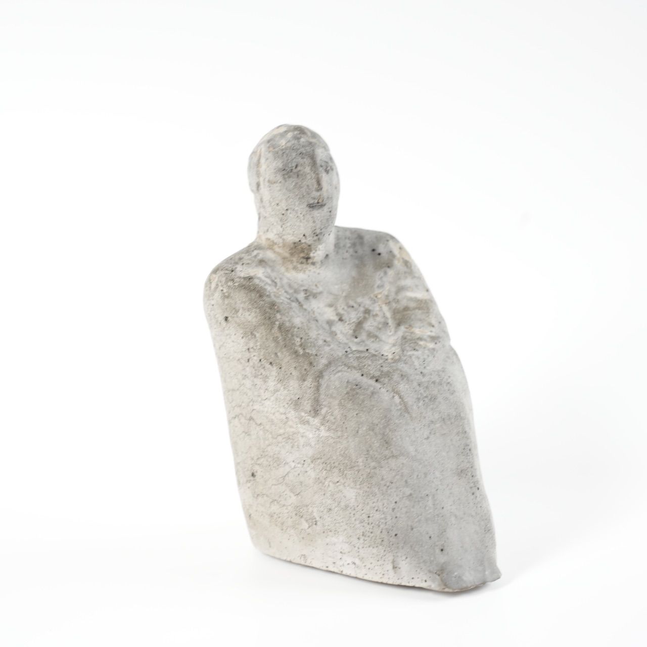 表面の質感から本作はシリコンの型枠に入れて作られたようです。型枠の跡は見えないように削られ処理されています。表情については後からモルタルで整形処理を行っているため、わずかに本体とは色が異なっています。顔の細かい造形を行うために本体のコンクリートの硬化後に、顔面に薄くモルタルを塗って、ヘラを用いて通った鼻筋や物憂げな目元が表現されています。