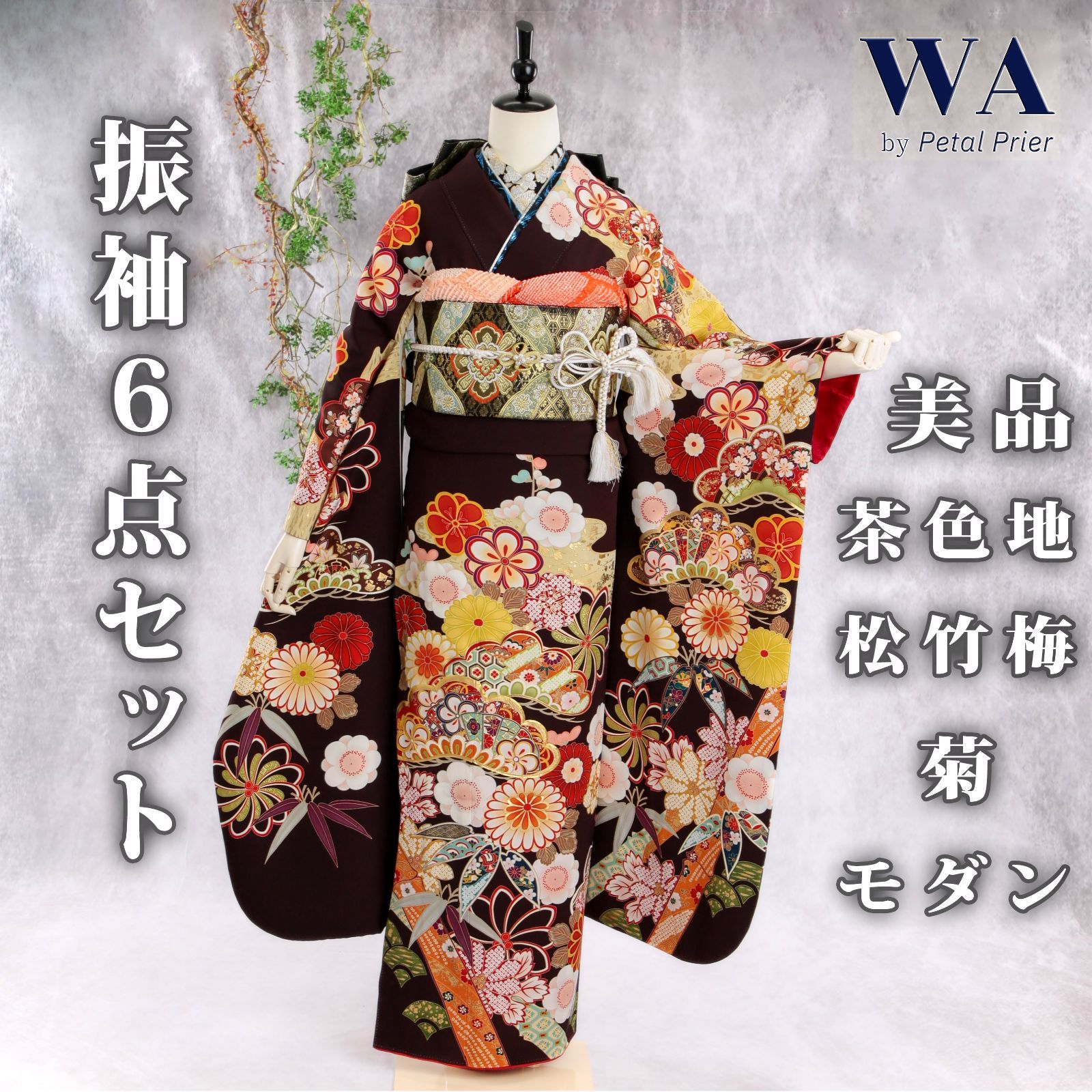 振袖フルセット 振袖セット 振袖 Lサイズ 茶× 典 成人式 着物 晴れ着 6点セット FN-445
