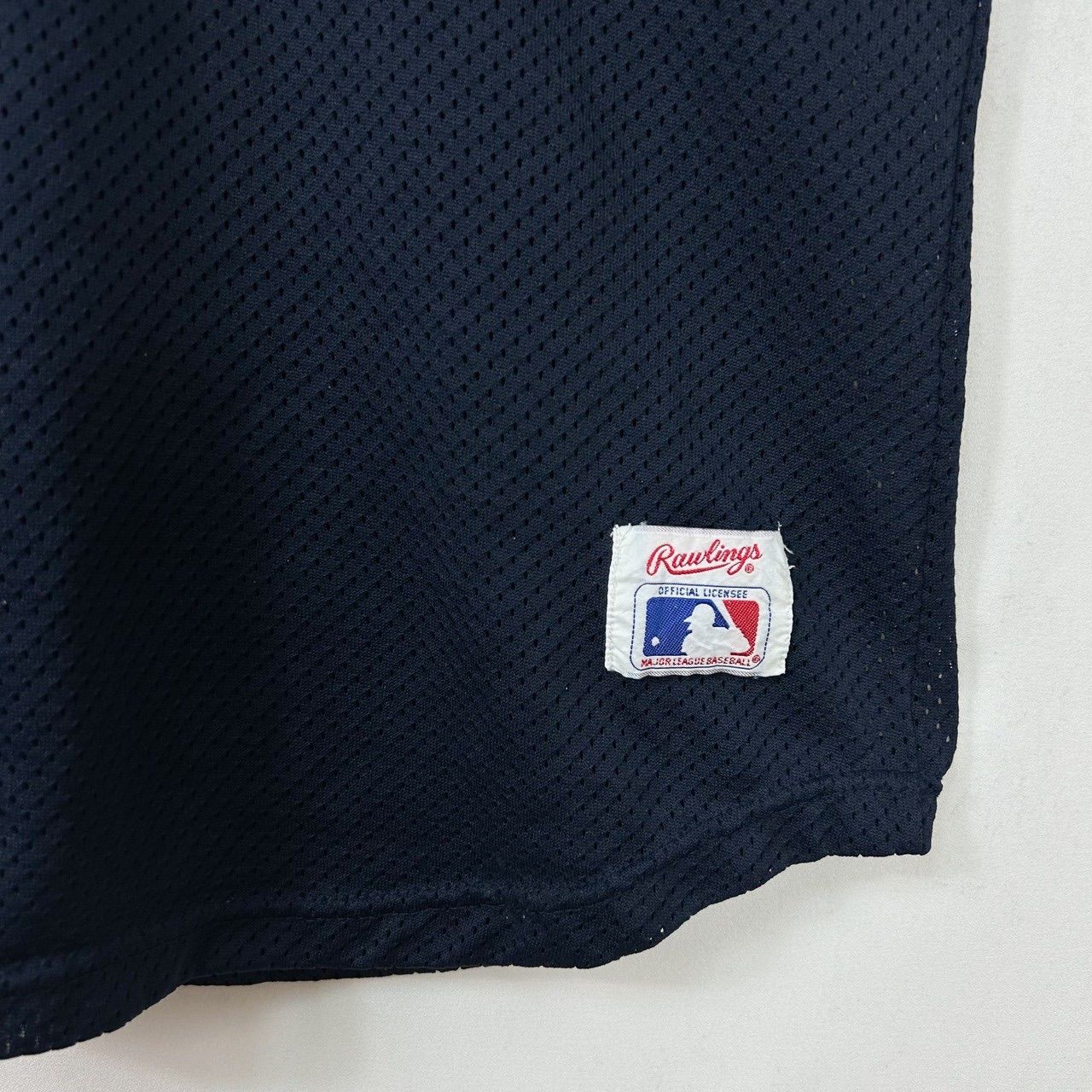 MLB クリーブランドインディアンス Cleveland Indians マジェスティック 刺繍ロゴ メッシュ 半袖 ゲームシャツ ユニフォーム 輸入古着 海外古着 メンズ ネイビー Lサイズ S 92-6