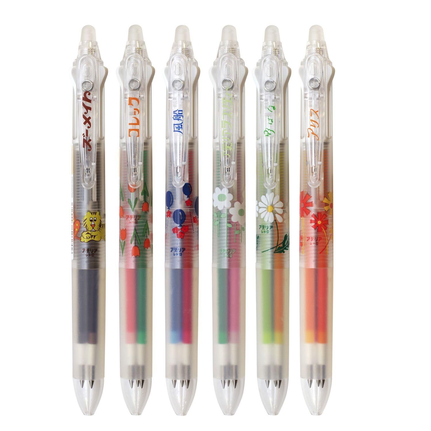 手帳やメモに、細かい文字も書き込みやすい0.38mm。人気のフリクション3色スリムタイプ6本セットです。。いつものペンを、昭和レトロで大人気の「アデリアレトロ」デザインに。。「アデリアレトロ」は、かつて昭和の家庭で使われていたアデリアのグラスウェアを、現代でも安心してお使い頂けるようリメイクした製品です。。代表的な商品の一つは、花や動物など、かわいらしい柄をあしらったプリントグラスです。。そんなデザインを毎日持ち歩きたくなる、「アデリアレトロ」柄のエモいペンたちに仕上げました。。。。方式:ノック式。