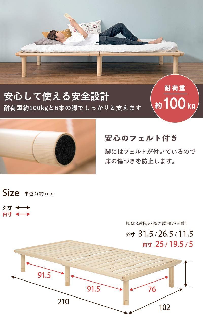 数量 ベッド すのこベッド ベッドフレーム 敷布団 安心の耐荷重100 kg 萩原 Hagihara 3段階高さ調整 天然木パイン材 ロングサイズ シングル ナチュラル WB-7706 SNA