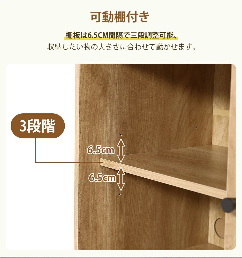 【可動棚付き】棚板は6.5cm間隔で三段調整可能、収納したい物の大きさに合わせて動かせます。