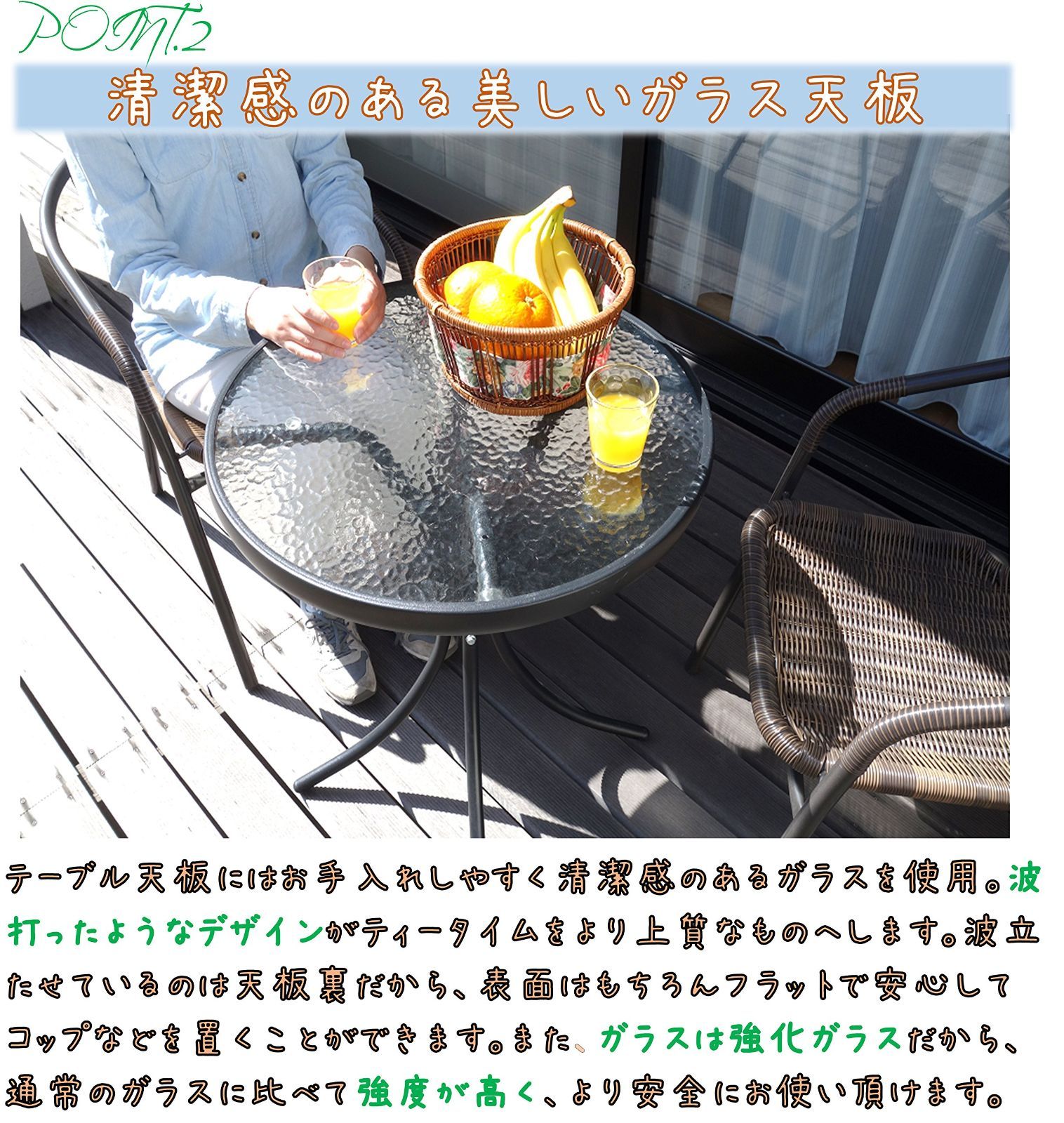 ●ラタン調のオシャレなガーデンファニチャー3点セットがお買い得 ●ガラス天板のテーブルが高級感を演出。本製品を置くだけでベランダやお庭、テラスが一気に華やかに! ●ガラス天板だから、飲み物などをこぼしてしまってもお手入れ簡単。 ●テーブルのみ組立品で組立簡単だから、届いた日からすぐに使えます。 ●チェアは完成品で箱から出すだけ。 ●使わないときは折りたためば椅子をスタッキング(積み重ね)すれば、省スペースで収納ラクラク♪