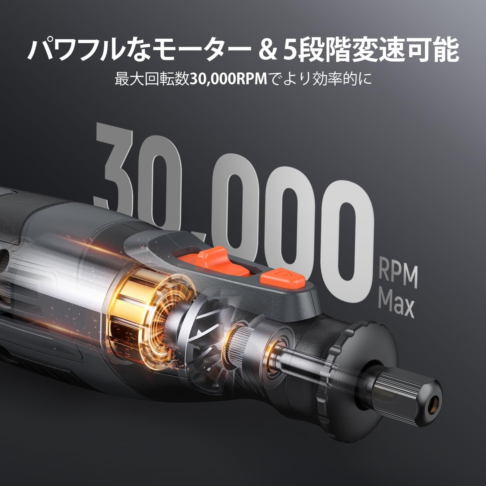 【5段階可変速 & 30000RPM】8V DEPSTECH A1L コードレスミニルーター、パワフルなモーターを搭載しています。5000回転/分から30000回転/分までの5段階可変速で、スピードを自由に調節することができます。また、5分間の速度設定を記憶する機能で、短時間での頻繁なスピード調節は不要です。5分後にはデフォルトの速度に戻ります。DIYや家庭のプロジェクトのほとんどのニーズに対応しています。