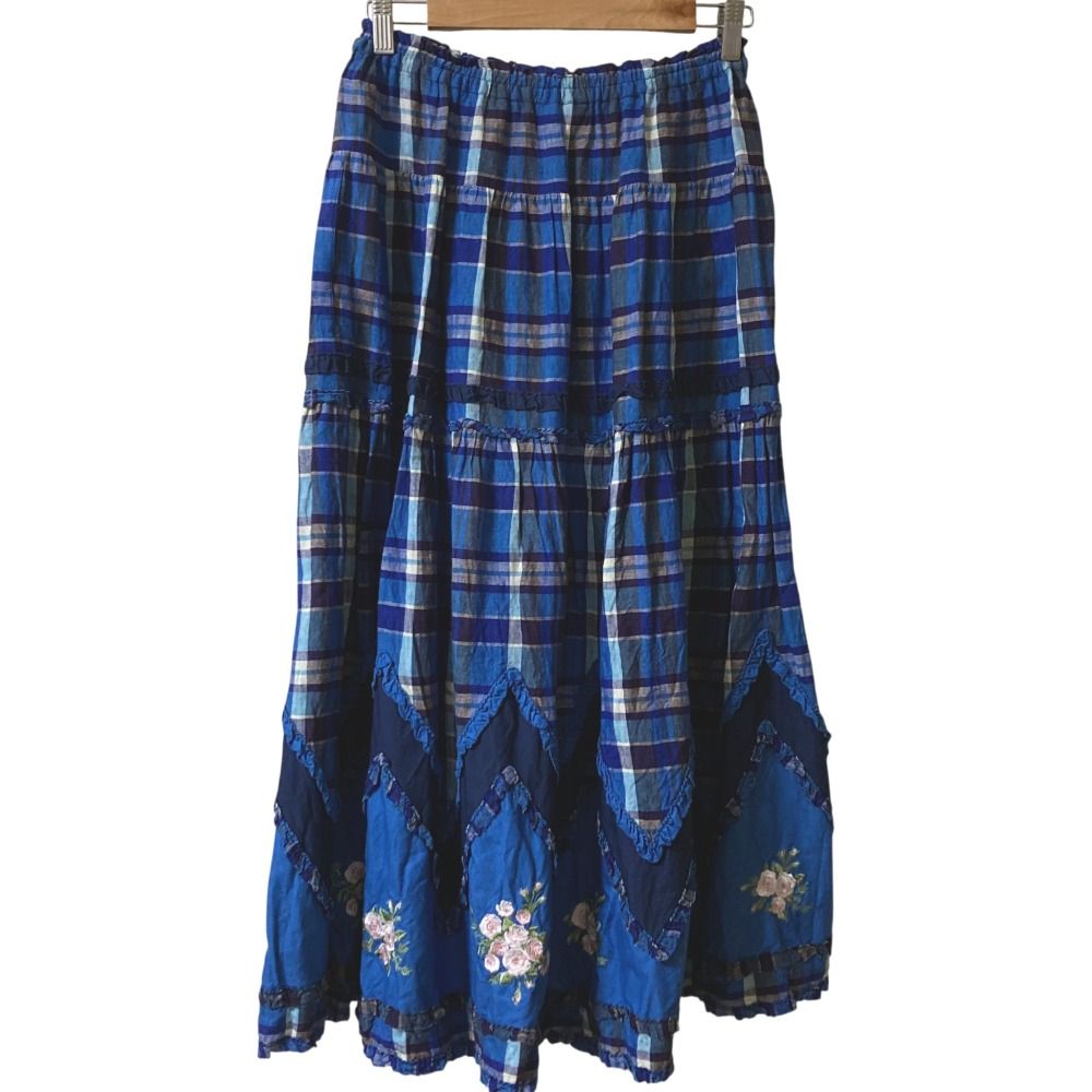 PINK HOUSE ピンクハウス マドラスチェック ブーケ刺繍 リネン ティアードスカート ブルー レディース 古着