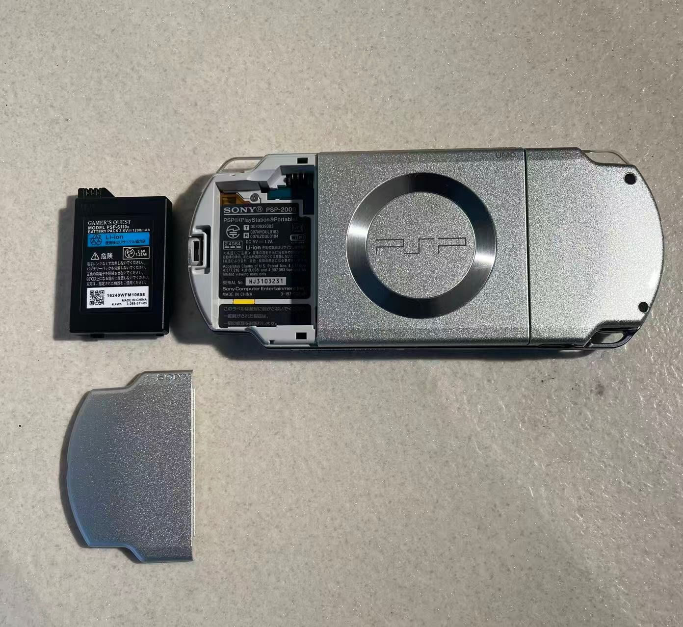 アイスシルバーのPSP-2000 IS、取扱説明書とUMD付き、良好な状態。