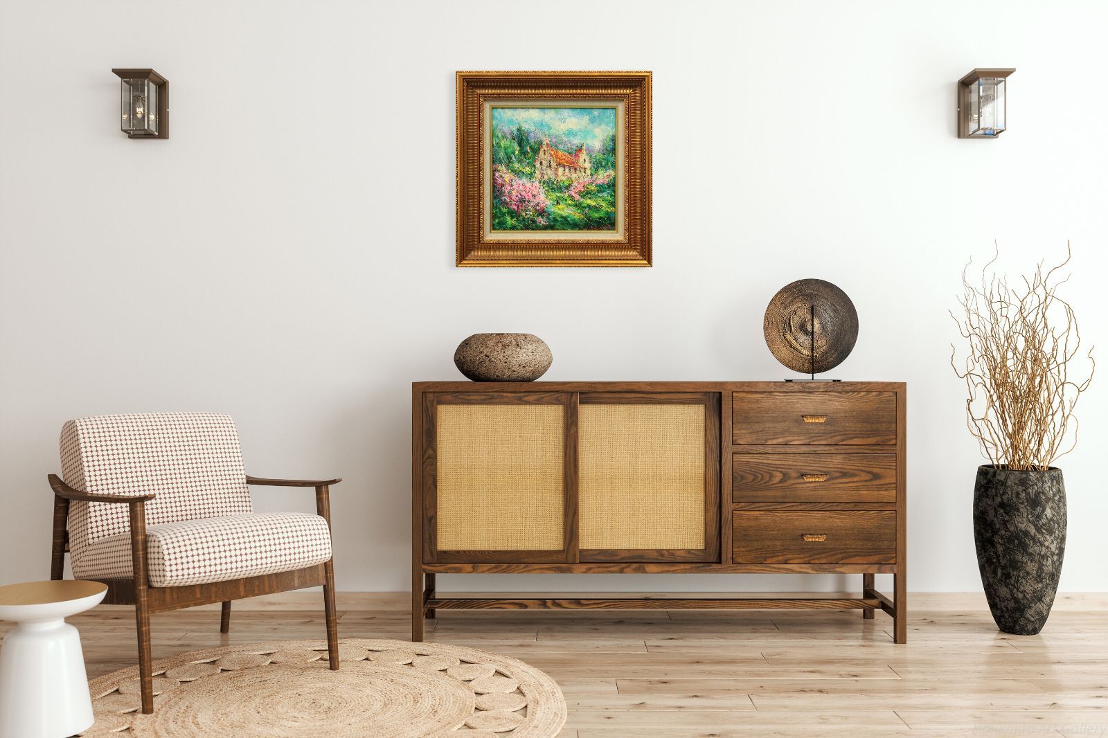 幾多の経験を重ねた確かな筆致が、豊かな自然と橙色の屋根の家を、幸福感に満ちた午後の景色として鮮やかに描き出しています。鮮やかな色彩が織りなす情景は、穏やかな安らぎに満ちています。