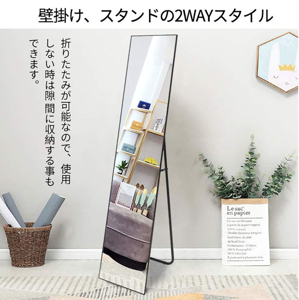 ミルオ君の鏡工房 全身鏡 姿見 スタンドミラー 壁掛けも対応 アルミフレーム 飛散防止 スタイリッシュ ウォールミラー インテリア 144x32cm (ブラック)