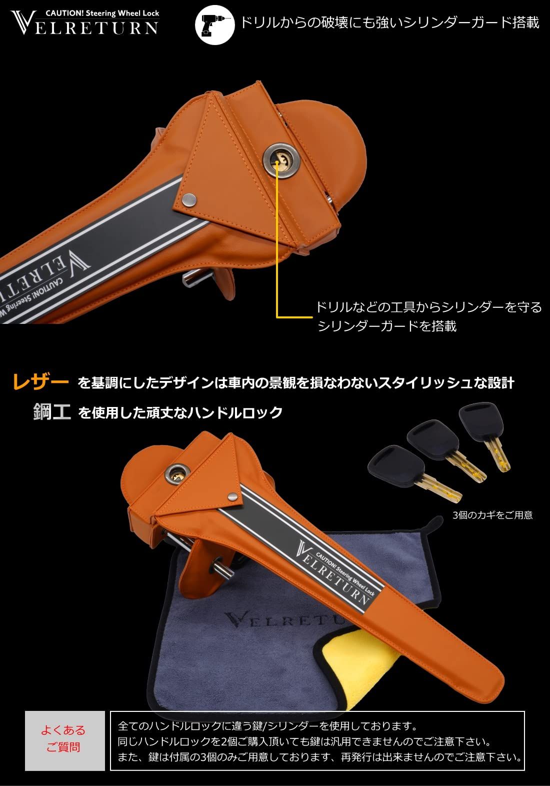 VELRETURN (ヴェルリターン)自動車用セキュリティのハンドルロックです。このハンドルロックの特徴は非常に硬い素材の鋼工で作られている事と ハンドルロック全体をレザーで覆っている点です。VELRETURN (ヴェルリターン)は自動車販売/カーディティーリング/カスタム/メンテナンスのプロフェッショナルが 生み出した自動車専用のセキュリティブランドです。自動車の盗難は窃盗犯が犯行を行いにくい場合は無理に犯行に及ばない事がよく言われております。そんな中、ハンドルロックが 取り付けられている事が分かりやすいデザインで、尚且つ愛車のデザインを損なわないハンドルロックを開発しました。