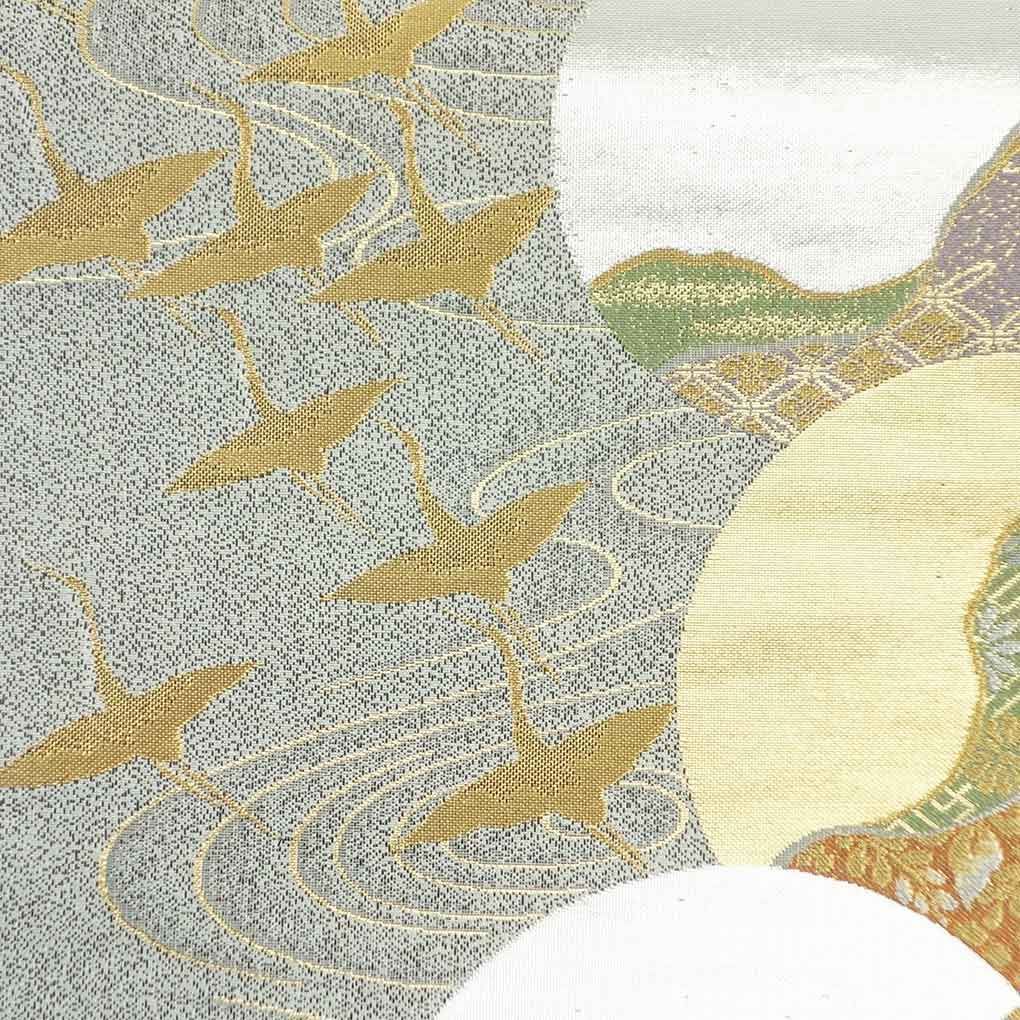 袋帯 幅30.5 cm 長さ450 レディース 鶴 秋冬春用 正絹 シルク グレー リメイク リユース リサイクル 呉服のきくや