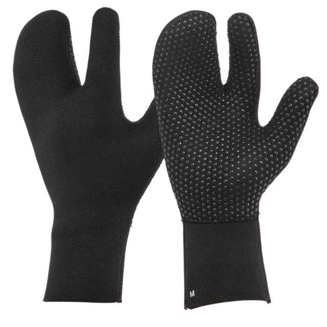 寒冷地向け3mm厚3本指ミトングローブ。手首裏面に配した吸水率の低いメッシュリペルスキンが、フィット感を高め水の浸入を防ぐ。